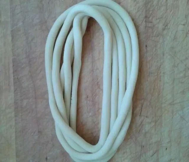2、面团醒好之后再揉一下,擀成长方形的面饼,不用太薄,1.5厘米左右,然后用刀切成条,并分别搓成长条。