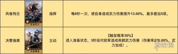 固有技能天下归心可使主将立即释放一次固有主动技能,并且提升该技能伤害。