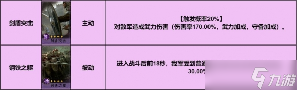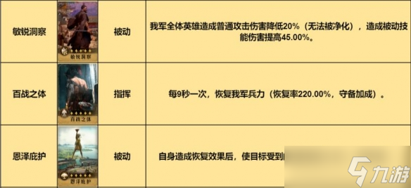 固有技能不败誓言在我军兵力低于50%时,获得持续回复和高额免伤(2分钟最多触发一次),并且随着兵力的下降可提高自身守备,是阵容的防守担当。