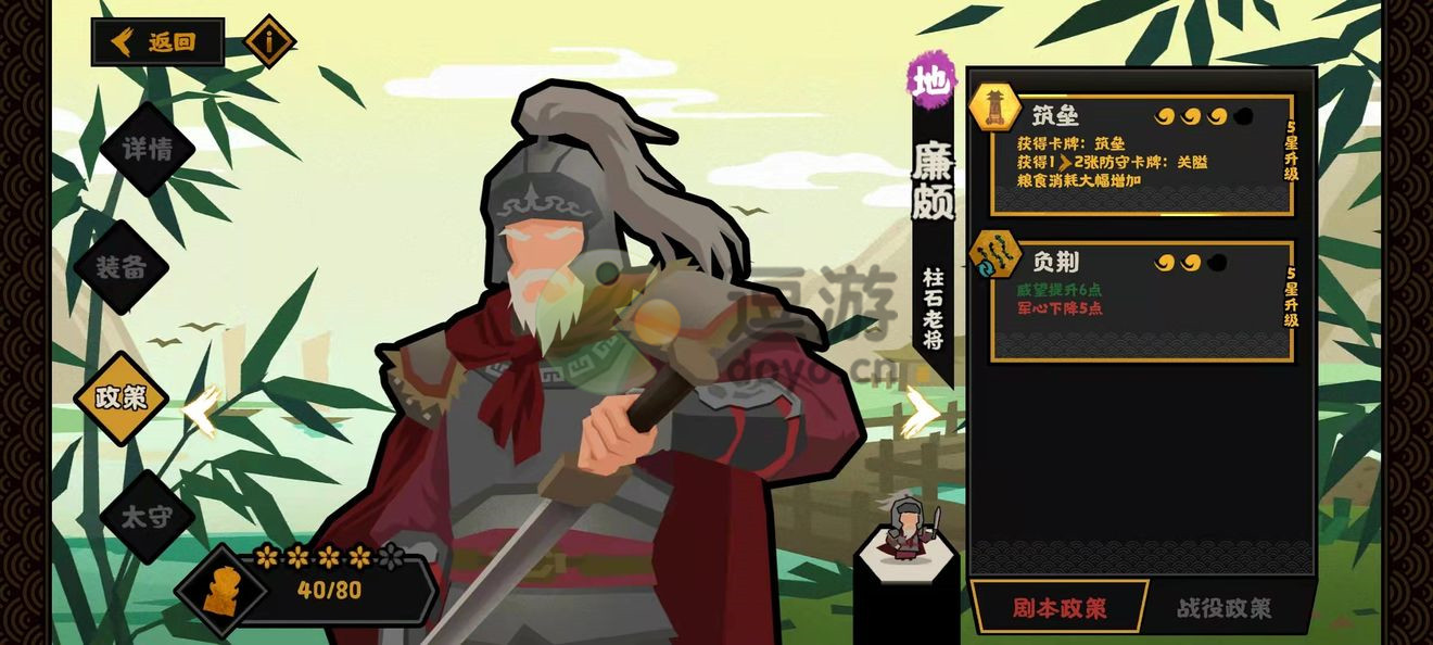 2.军事两位自然就是赵国双璧,李牧和廉颇。前者纯防守,提供一张伏兵和buff卡。后者多一张关隘进攻卡和两张关隘防守卡总计三张。这两位选谁都行防守战强度都不低的,廉颇也能客串一下低军心或者高威望流。总的来说光是技能就可以值100战力起步。如果星级高了还能带兵防守。汉朝的弓箭速射虽然拉跨,但关隘还是井栏还是连弩都能吃到速射的buff,奠定了防守反击流的防守必胜的基础。