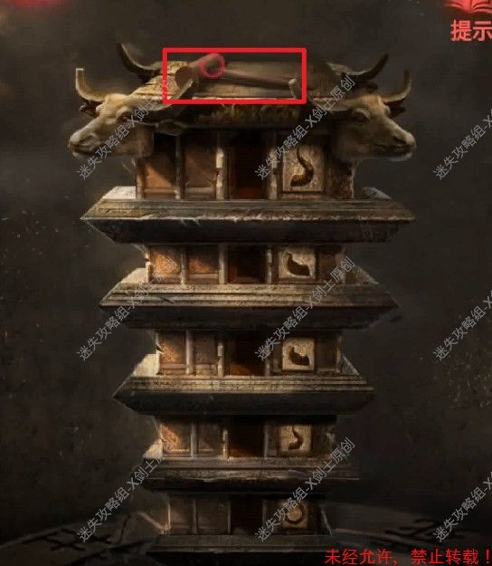 46.退出来点击中间的牛头,在这里我们首先点击左边的牛角,再拉中间的拉环,再点击左边的牛角,点击右边的牛角两下,点击左边的牛角,牛的嘴巴就会打开在最里面可以得到线索纸。