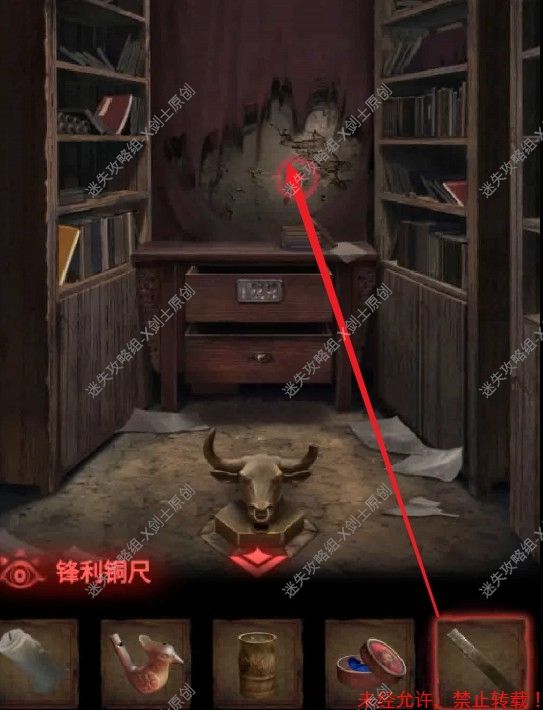 55.之后返回的时候老头又开始说话了,返回到中间有牛雕像的房间当中,使用锋利的铜尺对后面破损的墙壁。这样就可以得到南墙土了。