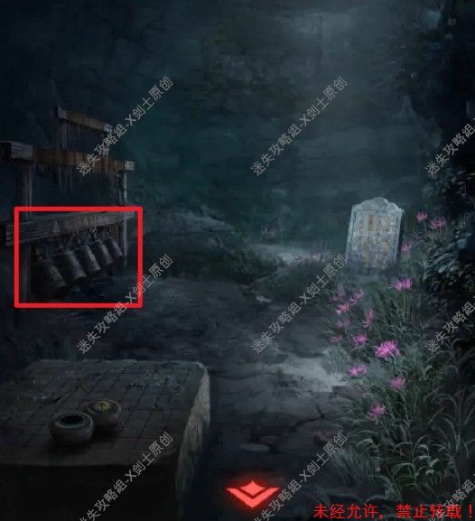 48.进入到新打开的石门当中,在这里点击后面的铜钟,在这里用小锤子进行小游戏。将钟从左到右依次分为五个,如图1352543,敲完钟之后就可以得到泥叫叫(编钟从左到右分别是“宫商角徽羽”,是我国五声音调中五个不同音的名称,类似现在简谱中的1、2、3、5、6。即宫等于1(Do),商等于2(Re),角等于3(Mi),徵等于5(So),羽等于6(La),亦称作五音;按提示将线索从右到左依次来)。