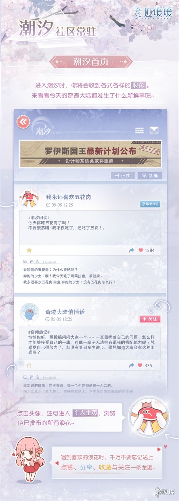 5月11日更新后,奇迹大陆“潮汐”社区即将长期开放,可通过“长期活动”海报或“寰宇时光”系列界面主题直接进入潮汐,浏览已发布的浪花内容。