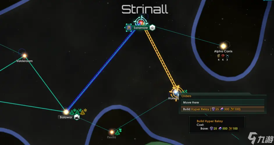 一条超空间航道的两端都建好这个建筑后,其通道显示会有一定的变化,如下图所示。同时,玩家可以直接在星系地图(大地图)中选择建造。